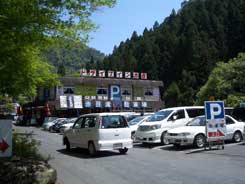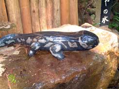 入山所前のドライブイン。ここに駐車してあとは徒歩です。天然記念物のオオサンショウオ。の模型。入山口に展示施設があり爬虫類好きな方にはいいかも。