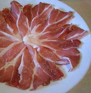 生ハムです。 メニューでは生ハムとモツァレラなのですが、モツァレラが少し苦手なので無理を言って生ハムだけを盛り付けていただきました。 塩気のきいたおいしい生ハムです。 |